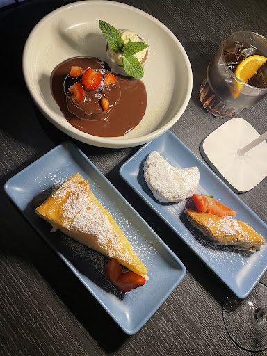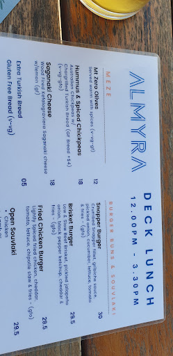 DINNER: For our starters, our highlight dish was the Taramasalata QLD Mullet Roe with Pita Bread!!! You cannot go to Almyra and NOT order this amazing starter. We also had the Saganaki which had been toasted to perfection and the King Fish Sashimi. For mains, we had the Char-grilled Octopus and Wagyu Souvlaki and our plates were spotless by the time we started our desserts The desserts are traditional greek desserts which were clearly made with love. The Galaktoboureko, Baklava, and Ouzo Shortbread were suggested by the staff, and we loved it so much that we had to take the leftovers home to not waste it. The drinks were reasonably priced and came very quickly, but what was even better than the ocean-front view were the service from staff members Carly and Mikhail who really catered to us and addressed any and all concerns.