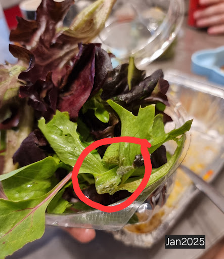 Salad leaves š in a small container with a wedge of lemon looked a bit sad to me. I picked one up and ate but I was shocked after I saw next when I was going to get some more. The leaf that was gone bad and had mould on it. It's unacceptable and not safe for consumers at all.