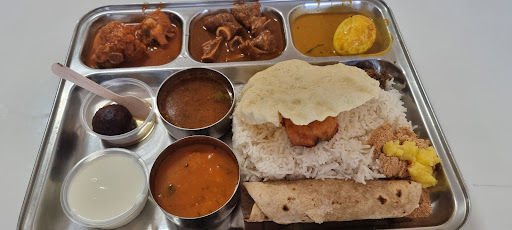 The non-veg thali (platter) comes with servings of - Mutton stew, chicken curry, egg curry, rasam, yoghurt, pickle, papadam, rice, chapati and podi with ghee. The authentic taste and size of serving blew me away, Oh you also get a serving of sweet - mine was yummy gulab jamun.