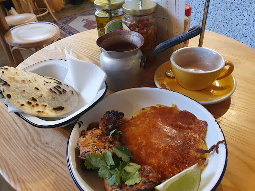 Ummmm amazing! Immediately my new favourite local spot. I got the choclo (corn and grilled cheese arepa), morcilla arepa pocket, and a side of chicken. The servings are bigger and more filling than you'd expect, be warned. Food is so fresh, high quality, arepas are a delicious texture, bursting with flavour. Simple and perfect Colombian flavour/ingredient combinations. Their table sauces - a green chimichurri and a pink, red onion/chilli/pepper salsa I forgot the name - are just so delicious and bright tasting (and, side note, are also surprisingly friendly to a not-so-spice-tolerant palate, even with plenty of chilli flavour). It was very exciting to find that the black pudding is gluten free - in fact the whole menu is gluten free aside from a couple of dessert/drink items. I also had a delicious Colombian hot chocolate which reminded me of Mexican champurrado chocolate flavour. The atmosphere is the best, warm and bright inside with plants and decor, good music, you can see into the kitchen through beautiful stained glass, and there are overhead heaters - so lovely. Lively...