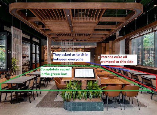 What happened was when we entered, we noticed existing patrons were all cramped to one side (red box). Next we were directed to sit right in between all of them (blue arrow) which was way too close for comfort, I can easily stretch out and touch another customer's shoulder.