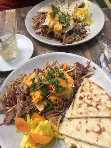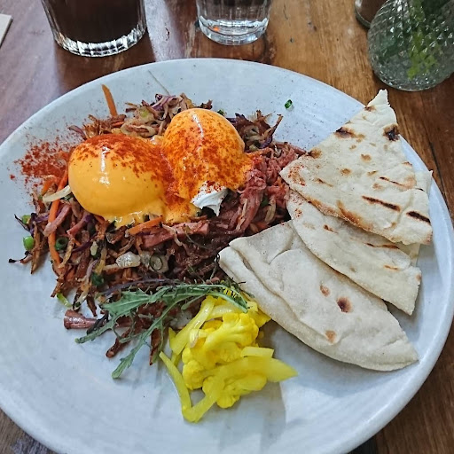 The corned beef was plated with a lot of colour. The corned beef was shredded and tossed with the potato strips so it was crispy and crunchy and served with two poached eggs and a little bit of pickled vegetable and three pieces of flat bread. This was $21.5.