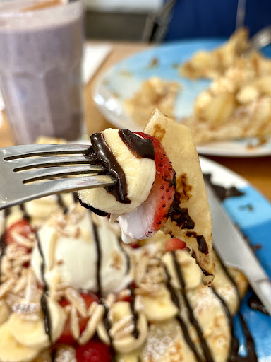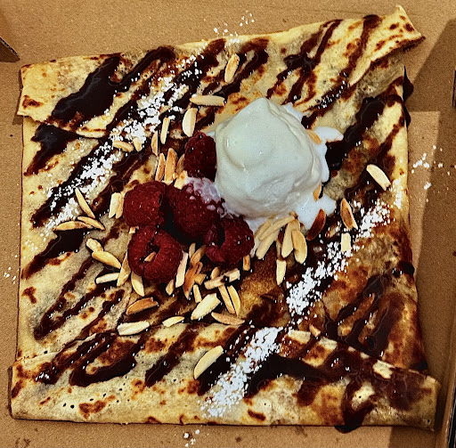 Both crepes had chocolate drizzle, strawberries (which I was told a few minutes after ordering that they had ran out of Strawberries and offered Raspberries as a substitute), vanilla ice cream and toasted almonds. One of them was supposed to have banana as well, but I’m not sure if they also ran out or just forgot to add them? Or perhaps it was just some sort of banana flavouring, whichever the case there was no taste of bananas.
