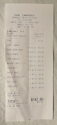 Review:- My experience at this restaurant was one of the worst ones I ever had in Melbourne. First of all Staff was not friendly, as they were not ready to arrange us a spacious table and they were pushing us to order soon as we sat as they wanted to close the kitchen though we still had an hour before the restaurant actually closed. I ordered starters and main course, and my starters were interrupted by the main course, I didn’t even finish it and they got the main course items and my Biriyani was super dry and not tasty at all. Tandoori Chicken was not properly marinated and it was served partially cooked. Corn soup was the only item that we enjoyed. Item prices advertised in the menu booklets are different than the actual price of the item and they didn’t inform that until we paid the bill and found out in the receipt. I am never recommending this place to anyone.