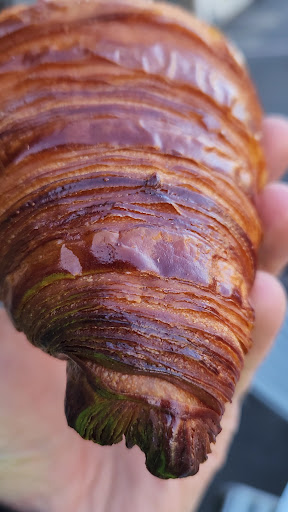 The croissant is a bit different. It's well laminated as you would expect, but the dough is a sourdough, I believe. It's nuttier, chewier, heavier, and they have great bite. It's a unique croissant, and that's why I love it. The breads are also very highly rated. People come from all over Melbourne for them. I also had the cinnamon pastry, which was fantastic. It stayed fresh all day, so I had it in the afternoon with a beautiful pourover coffee.