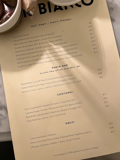 Here is why: The online booking form: âis it a special occasion?â to which we answered âyes, itâs a birthdayâ. Other eateries weâve been to acknowledge the message with a little something extra like a candle sitting amongst the âpetit-fourâ for example or just a flower to make it 'special'. Bar Bianco: niente, nothing, zilch, not even asking âŚ.. clearly a management issue. Drink for starters. We order Prosecco from Italy. It arrives in glasses; it was not poured at the table so we could see the label of the bottle it came from. It could have been anything âŚ. Wine. We order wine by the glass. A Bordeaux from France. It arrived in a carafe, again not poured into the carafe at the table as it should be. We again could not see the label of the bottle. The wine was below standard we expected, so it could have been some cheap plonk or âChateau Incognitoâ from anywhere. Food: ⢠EntrÄe: Calamari Fritti, Lemon + Herbs, Smoked Paprika, Aioli or simply, Calamari, fried. The chef must have poured a whole packet of salt on them. The salt was overpowering any flavour the calamari might have had. We kept soldering on, thinking the flavour would improve. A mistake. ⢠Bread: Baker Bleu Bread, Olive Oil + Balsamic â superb. ⢠Mains for Madame, Tartare di Manzo, Beef Tartare, Quail Eggs, Black Garlic. Superbly flavoured and perfect 10/10. ⢠Mains for me, Slow Cooked Lamb Ragu Pappardelle, Pecorino served in a bowl with fork and spoon. The lamb was well cooked, in a tomato-type sauce - which I could not desipher - sitting with flat very wide pasta strips, the length of spaghetti. Pasta is al dente. The dish has absolutely no flavour, zero taste, like coming out of the water. Even ground pepper could not enhance this serve. Again, kept soldering on, thinking the flavour would improve. A mistake. ⢠Desert: for Madame, Coconut Panna Cotta, Mango + Mint Salsa, Roasted Coconut. Superb ! ⢠Desert: for me: Dark Chocolate Cremoux, Chocolate Sable, Mixed Berries. The Chocolate base was as hard as a rock with some Raspberries, smothered in Raspberries sauce so sour it killed all other flavours there might have been. Again, kept soldering on, thinking the flavour would improve. What a mistake, I had the sour taste in my mouth till the next morning. It was a shocker! ⢠Service: Our table was attended by a young Italian, here in Aus on a working visa. His service was very attentive and also very discreet, as it should be. A true professional who knows what he is doing ! I take my hat off ! ⢠Atmosphere: the place is well fitted-out, has a good atmosphere and is small, which is what attracted us.