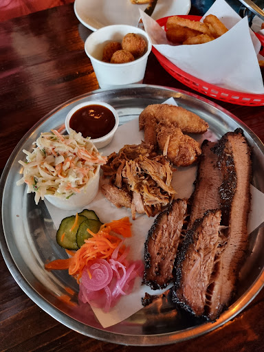 Read moreTasty American BBQ joint serving up some authentic cuisine. It's definitely one of the better BBQ joints we have been to in Melbourne, but I still left feeling it just didn't deserve 5 stars compared to the real deal. The brisket was nice, but a tad dry beyond just the burnt ends. Pulled pork was my favorite, but lacked a vinegar based bbq sauce, which is my preferred sauce. Charging for extra sauce is criminal in the BBQ world, especially if you are daring to serve up something a bit dry! A variery of sauce bottles sitting on the table is standard in a true authentic experience. Fried chicken was pretty good but nothing out of this world. The jalepeno cheese bombs were flavourful and moist. The corn bread is massively overpriced for a muffin and it's an odd way of serving corn bread, but it was tasty none the less. It makes me think it may not be made fresh daily. The onion rings were delicious with a nice crispy batter. The slaw was enjoyable and had the right amount of creaminess and tang without being too heavy on mayo. The fresh pickles are a bit boujee but a nice touch to cleanse the pallet. That would typically be a stacker slice or a full on pickle, not a few token slices. Mac n cheese was OK, nothing special in my book. Would be great to see it smoked or served up with a little twist.