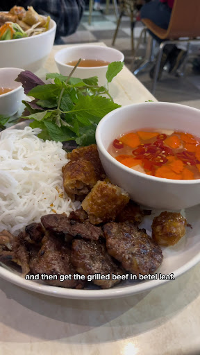 ⭐️ #23 Bun Cha Nem - This is my order every time, it has tasty grilled pork and patties as well as the crispy Hanoi style spring rolls, which are almost identical to what I tried in Vietnam! Sometimes the sauce can be bland. ✔️ #38 Bun Cha Gio Thit Nuong - More of a bowl style dish, with grilled pork, noodles, carrots, cucumbers, pork, spring rolls, peanuts and fresh herbs. We swap the regular spring rolls for the Hanoi style. Its pretty large, we do wish for more meat. ✔️ #39 Bun Bo La Lot - beef wrapped in betel leaf, chargrilled and delicious.