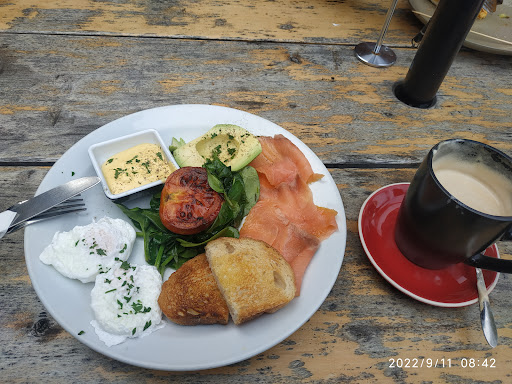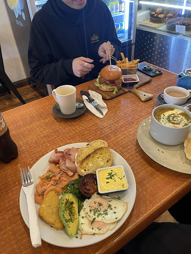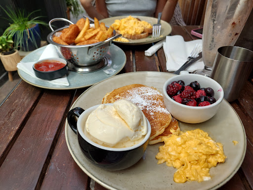 Large range of meals including breakfast, brunch, pancakes, lunches burgers, pasta etc. You can eat inside, out the front of shop or in the cute courtyard at the back. The serving sizes were surprisingly large while not expensive. About $17 for a full breakfast (eggs ,bacon ,mushrooms, avocado ,tomato,) Well cooked with good quality bacon and an entire 1/2 avocado. Coffee was hot and tasty in big mugs. I noticed other meals going past were equally large in size compared to other cafe’s in the area. Lots of yummy cakes available too. The shop was busy, and the staff were friendly and efficient. We didn’t have to wait long for our meal to come out. Clean toilets, high chairs and ample parking at rear In Woolworths carpark. Definitely...