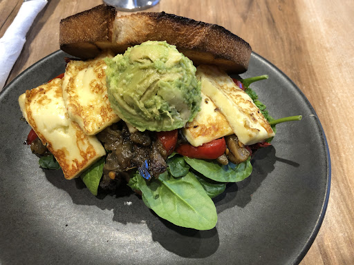 Next on my fave list is the - grilled veg, avocado and halloumi toast. Unbelievable! The eggplant is so creamy - the capsicum is perfectly grilled and the halloumi is so good that I always order extra.
