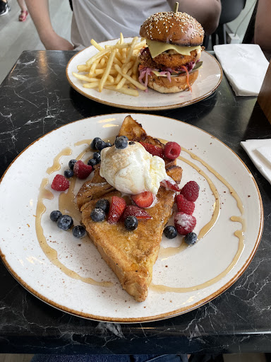 We had brunch during Father's Day 2024. It was still chilly with 13C and windy. The place has a manual sliding glass door. People who come and go would forget to fully close the door. And it was really annoying sitting there with strong cold air coming it. The cold air spoilt the atmosphere. I had to get up 3 times to close the door myself. I reckon it is time to invest for a automatic sliding doors. I ordered the angus burger. The burger and the chips are not even hot. Also the chips is coloured yellow, it appears to be not 100% natural. I have not seen a yellow coloured potatoes. I did not finished both my burger and chips. I also ordered small cup of hot chocolate -- and guess what... it was...