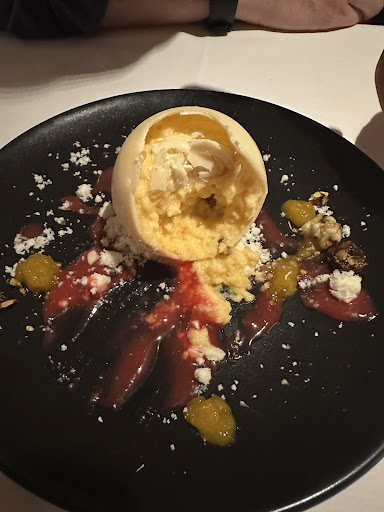 Food We enjoyed our entrees and mains but they did lack seasoning. Dessert was a bittersweet ending. The white chocolate sphere should never have been served. The lemon curd filling had split and curdled, resembling scrambled eggs. Also the pistachio praline was burnt and bitter, not to mention the thick sphere which was difficult to crack into. The pastry chef either knew there were issues and didn’t care, or requires further training. My white chocolate cheesecake was still frozen in the centre and lacked a distinct chocolate flavour. For a $150pp set menu, all three courses must be spot on.