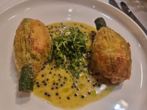 Enjoyed the stuffed Zucchini Blossoms with Prawn for entree and shared the Bisteca cooked perfectly medium rare to my liking.