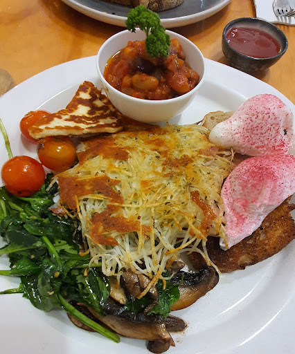 Chain of Fools Cafe - A favourite of the locals and named after the owner's favourite song! Always greeted with smiles when I appear, this is a must-visit cafe/restaurant as it's charm, energy and variety of menu options is hard to beat in the Bay-side area! I had the pleasure of having a wonderful 'Big Breakfast' today and my partner had the sumptuous 'Fools avo poached eggs'. The servings were just right and the visual presentation was - as usual - very creative! (Please see photos for reference). Well balanced vegetables including blanched spinach, fried mushrooms & tomatoes on sourdough toast with 2 poached eggs and a small bowl of fried beans. Now you do get the bacon normally but I opted for more cheese (haloumi in this case)! I cannot fault the taste and textures and the cooking method was excellent as the food was moist/tender and not dry or parched. The delicate Fools avo breakfast dish is something to behold with a well-decorated half avocado appearing to dominate the plate - with poached eggs on toast and a swirl of beetroot dip with garnish to boot. I can say the utmost care has been taken to entertain the customer besides satisfying the palate and this is quite a welcome gesture in today's cafe climate. The drink options are numerous - the chai is delicious and coffee is made well - and the customer service excels in every way. If there is anything you need, the lovely staff will ensure it is done in a timely fashion. Pricing is consistent with the area and surrounds, however there re a few surprises on the menu worth the low asking price. Overall I highly recommend visiting this little GEM by the sea and I personally wish to make it a regular! A content and happy...
