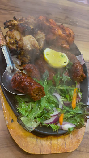 We started our meal with tea chai and mango lassi as our entrees were being prepared. The Samosa chat and onion bhajji delicious but it was the sizzle platter with its tender chicken that got the attention of the entire restaurant.