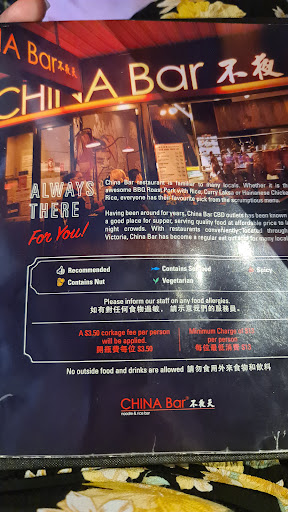 NEWLY OPENED CHINA BAR FRANCHISE Located within the new supermarket and eating precinct in Docklands. If you have eaten at other China Bar restaurants you will find this one very familar Same SE Asian-focussed rice and noodle staples served up in generous amounts and good quality. Service itself is also typical of China Bar.. perfunctory and transaction-focussed. be sure to know what you want to order (and where you will be sitting) before you line up to pre-pay for your meal. Wait staff will bring the food to your table. Takeaway also available. Cash and cards. People with mobility issues should be OK, although if in a wheelchair go for the tables that are "outside" in the lobby area - more room to manoevre. Toilets and lifts nearby. Oh - and if you order a drink, please tell them not to give you a...