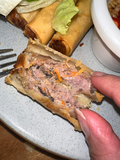 As I entered, I was presented by two large golden doors with many seats in the front of the shop. The restaurant was massive compared to the other Vietnamese resturants in the area. There was modern vintage decors, with one wall that looked elegant. The wall had a large fuchsia Sakura tree with sky blue hummingbirds perched upon the branches. I was thoroughly impressed, the smell of roasting herbs and a mix of spices enlightened the atmosphere.