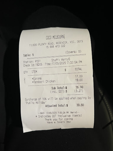 Read moreI recently attended the Bollywood Night at Coco Melbourne after seeing their promotional ads and marketing, which made the event seem exciting and well-organised. The entry tickets were advertised at $26, so my friend and I bought ours in advance, genuinely looking forward to a fun night out. However, the experience was a total letdown from the moment we arrived. When we entered, no one even bothered to check our tickets. People were just casually walking in without showing anything. It felt completely disorganised and made me question why we even paid for tickets in the first place. Honestly, it felt like a scam they advertised ticketed entry, but clearly didn’t enforce it. The music inside was insanely loud and I’ve been to plenty of clubs and DJ nights, so I know what to expect. But this was on another level: not enjoyable, just overwhelming. To add to that, we ordered food which was not only below average in taste, but also mispriced. Menu prices didn’t match what we were actually charged items listed at $11 were charged at $13, and something listed at $18 was billed at $19. It wasn’t a huge difference, but it’s the principle. If you advertise a price, you should stick to it. In total, including the tickets, food, and a sisha, we ended up spending around $150. And honestly, it felt like money completely wasted. With that kind of money in Melbourne, you can easily enjoy a great night out with good food, music, and service places that actually care about your experience. This night at Coco was a huge disappointment. I wouldn’t recommend it to anyone. Save your time and money there are far better...