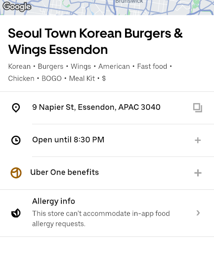Warning! Be careful!! They run this as a GHOST/ VIRTUAL kitchens in Uber Eats. Ordered from "Seoul Town Korean Burgers and Wings" and selected Pickup. Basically CookHouse burgers selling their chicken burger as korean.