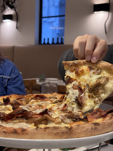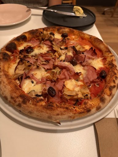 The server offered us a choice of still or sparkling water, and we opted for sparkling. To our surprise, she brought out a branded sparkling water, which wasn’t what we expected; we thought it would be a simple tap sparkling water. We ordered a pear salad and a Capricciosa pizza, along with house bread. The bread portion was small—just two tiny pieces. The salad was passable, nothing particularly special, and the pizza was similarly underwhelming, with a chewier texture than I would’ve liked.