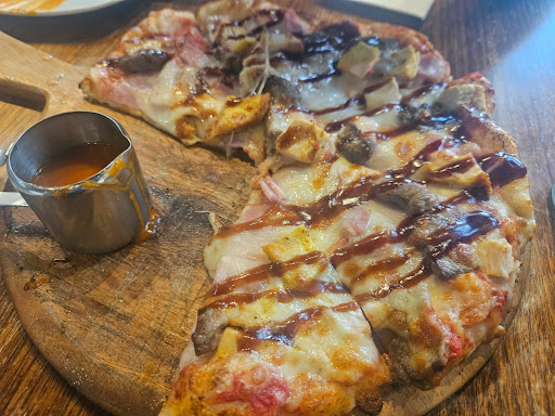 So we sat down. For the entire meal I could smell the sponge on the table as I was sitting and we were there for at least an hour. I asked for some water and it was delivered in a glass that was clearly dirty (lip prints and finger prints) and I had to ask for another. When our pizza arrived I was given a dirty fork (food between the prongs). The pizza also had deli ham on it, I expected better quality ham on it to be honest. It wasn't too bad, I liked the crust a lot. While we were there two families left and their outdoor tables were left unwiped and dirty even after being cleared for the rest of the time which was well over 30 minutes for each table before we left. They were not busy at the time we arrived or left, we didn't come at a busy time.
