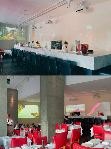 The venue itself has a rather cold ambiance, dominated by high concrete walls. The atmosphere was further affected by the large projections on the walls. While the idea of projecting movies might seem artsy, it didn't add to the dining experience. In fact, one particular projection of a lady in the ocean with rocking waves made me feel a bit queasy when looking in that direction for too long.