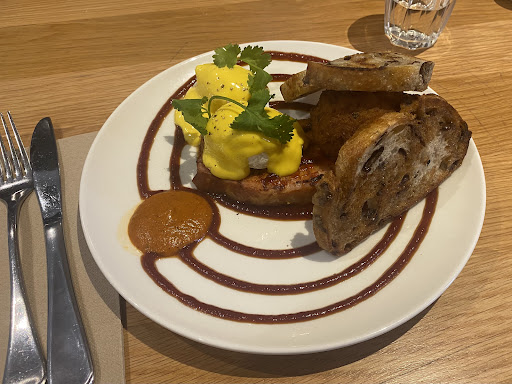 I was greeted by warm smiles and greetings and this was pretty consistent throughout my experience. I ordered an oat cap and the Dish and Spoon Bomba No. 4 - copy pasted from their menu this contains a âPOTATO BOMBA, THICK CUT MAPLE GLAZED BACON STEAK, CORIANDER, SPICED ROMESCO, POACHED EGGS, SAFFRON TOMATO HOLLANDAISE, OLIVE TOASTâ. I donât know what I was expecting but I just wanted to try something different. The serving was huuuuge. The photo just does not do it justice. All of the elements went incredibly well together - my faves being the olive toast and the maple glazed bacon. The bacon was definitely very thick, and so was the potato bomba (best way I can describe it is similar to a croquette). It was a bit much for me in terms of size and all the elements being so heavy, but overall the taste was great. All the flavours were already on the plate with the sauces and spices - there was zero need to add much else but a bit of pepper. Iâd recommend sharing with your mate or significant other if you ever end up ordering the bomba.