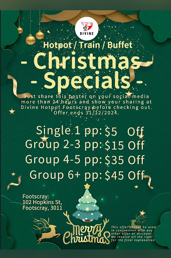 Read moreI had a delightful dining experience at the Devine Hot Pot Train Buffet. The culinary offerings were impressive, with a diverse selection of soups available. Although it's uncommon to pay separately for soup at a buffet, I found the costs to be quite fair. My selection of the Tom Yum soup and my wife's choice of the Chicken soup did not disappoint; both were superb. The range of seafood and meats was extensive, featuring delicacies like baby octopus, prawns, basa fish, cuttlefish dumplings, mussels, lobster balls, fish balls, crab nuggets, crab sticks, lamb, beef, and more. The staff's hospitality was noteworthy; they were exceptionally courteous and attentive, ensuring our soups were continuously replenished. The Oolong milk tea was a refreshing beverage, and the dessert selection, including ice cream, brownies, jelly, and rockmelon, was a delightful conclusion to the meal. Despite the restaurant's modest appearance, it comfortably accommodated my larger stature. In my opinion, this establishment offers excellent value and comes highly...