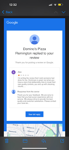 At 8:20 (1.5hrs after ordering) the app declared that the pizza had been delivered (suspiciously without GPS tracking for the driver), however nothing was at my door or on my security camera; I called the store 7 times without success (ringing out). I then tried calling 3 other stores, all of which could not help (you’re at the mercy of the store that has your order). The app also doesn’t have a proper help function, it instead relies on and is at the mercy of the stores. In this regard, a bad store (like Flemington) can just take your money without any recourse.