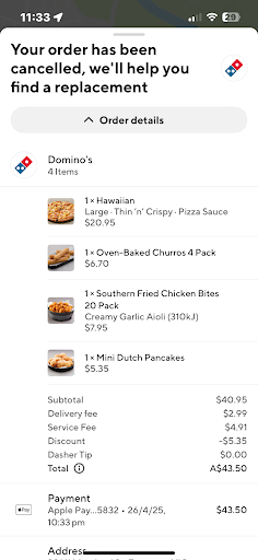 Read moreSeriously disappointing. I’ve always have gone through domino’s for my goto pizza joint for years but on 3 separate occasions they have made mistakes on my order. To the point they never made my order and I waited over an hour then called, was spoken over the top of before I could even explain what was in my order. Then they sent me the wrong order. Refused to rectify the situation. I wasn’t in the slightest disgruntled or upset it’s still food. Anyone who decides to order dominos through Menulog give the restaurant a call 5 minutes after placing your order to make sure they received it. In my opinion seems all too much and will just order food...
