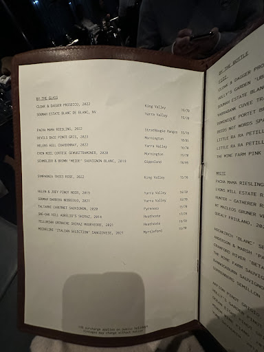 FEATURED: ๐ท Riesling [$15.00per glass] ๐ท Sauvignon Blanc [$18.00 per glass] ๐ท Chardonnay [$16.00 per glass] ๐ฆช Oyster w/ mignonette [$6.50ea] ๐ฅฉ Istra croatian hot kulin salami [$24.00] ๐ฅ Pomme de terre, truffle salsa, salmon roe [$12.00ea] ๐ฅ Ravioli, butternut pumpkin, burnt butter, sage [$32.00] ๐ Gisborne Duck Ragu, fettuccini, rucola [$38.00] ๐ Bannockburn Half chicken, chimichurri, burnt lemon [$45.00] ๐ฎ Brรปlรฉe [$16.00] ๐ท Dessert wine: Fighting Gully Petite Mensang Moelleux