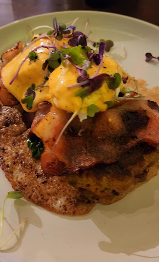 Starting w a chai tea to warm me up, I then tried the Everest Benedict, which was delicious. This was Himalayan Grilled Chicken, w crispy bacon, poached eggs, sauteed spinach, and siracha hollandaise on a rice crispy. OMGosh, this was so good.