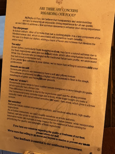 Ā Ā Ā Read moreOur evening began slightly late as we were late to our booking, but seated anyway for which we were very thankful. After being seated in what felt a little bit like Disneyās version of an Italian restaurant we read the disclaimer (pictured) placed on the table, explaining that we might find our food too salty, pasta not al dente, and experience inauthentic, and giving the reasons why. Possibly a clue for later!