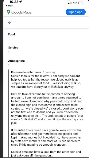 Read moreWhat a joke!! We arrived at 1.51pm to be told by an arrogant guy âwe are doneâ My husband didnât hear what the guy said and proceeded to ask for a table for 3, to be told again âwe are doneâ by the same guy who just kept walking. Absolute rudeness! Little do you know mate, we were only after 3 milkshakes that my 5yo daughter wanted to do for Mothers Day!! Not only have you shocked us by your rudeness but my 5yo is completely blown away with how rude a shop man can be!!!! We will never return!