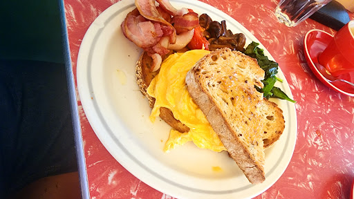 The Food – The Drunken Sailor Big Brekky Both Liz and I went for "The Drunken Sailor" big breakfast, and it did not disappoint. Generous portions of scrambled eggs, crispy bacon, roasted mushrooms, tomatoes, sautéed spinach, and thick slices of buttered multigrain toast made for a hearty and satisfying start to the day. The eggs were creamy and cooked to perfection, and every element on the plate was fresh and full of flavor.