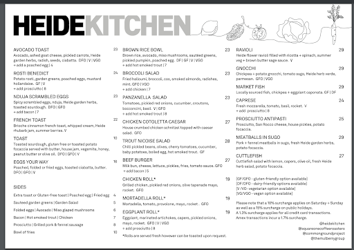 Pricing - we paid just over $92 for two good sized breakfast meals (avocado toast + a poached egg and a rosti benedict + a side of bacon, two cups hot chocolate, one mug black coffee, one glass juice). It seemed like a fair bit, but when we checked back on the website today, it does say that Heide Kitchen charges 10% extra on Saturdays and Sundays. So, if you don't want to pay that, avoid a weekend visit. It also charges a credit card fee of 1.3% for Visa/MC and more for Amex. So take cash if you don't want to pay a cc fee. Both things I wished we had checked before we went.