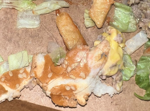 I get home and start eating my whopper which was prepared terribly with overflowing lettuce and the whole thing practically fell apart, but I could ignore that, it wasn’t until I was mid-chewing and felt a hair between my teeth. I spit my food out but the hair is entangled in my mouth. It took quite some pulling to get it out.