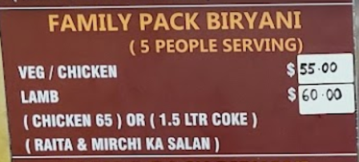 Read moreWe ordered the goat and chicken briyani with the chicken 65. Chicken 65 was yummy but only 3 pieces in a small circle tub, they didn't even bother to give us 2 other pieces to fill in the obvious gaps of space. It was stingey of them and too spicy. Should be medium unless someone asks. The chicken biriyani was barely seasoned and chicken was dry. The goat biriyani was just tasteless, weird tasting like it was cooked in some vinegary thing without any masala on the goat pieces and hardly anything on the rice. The goat was cooked well but tasted weird again, no seasoning. The sauce/gravy was watery and nothing and the raita was warm and watery. We really should have asked for a refund. We spent $43 and most of it went in the bin. For a Hyderabadi place what a shame. We used to order from there when it was under diff management and was hoping this was better. Unfortunately, this was worse than some North indian biriyani. I feel sad and shocked that i have had to give this review.