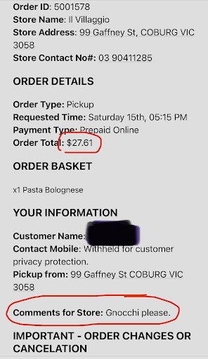Read moreI ordered pasta bolognese. There was no option to select the pasta type so I wrote in the notes âgnocchi pleaseâ. I came home to penne pasta which my kids did not like. I wouldnât have spent $27 on the pasta if I knew it was just penne. If gnocchi was not available, I would have expected a phone call informing me of this and cancelled the order.