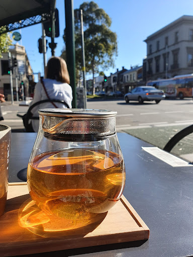 Seated outside (hold onto your bags ladies) we're on the corner opposite Shaw Davey with a pot of Hojicha tea. Wearing a hat but regrettably not sun block, should have bought a white parasol too.