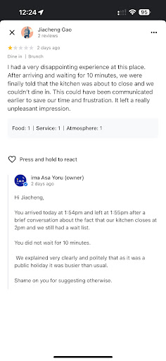 Read moreI had a very disappointing experience at this place. After arriving and waiting for 10 minutes, we were finally told that the kitchen was about to close and we couldn’t dine in. This could have been communicated earlier to save our time and frustration. It left a really unpleasant impression. ——————————————————————————— UPDATED REVIEW:(Reply to business)