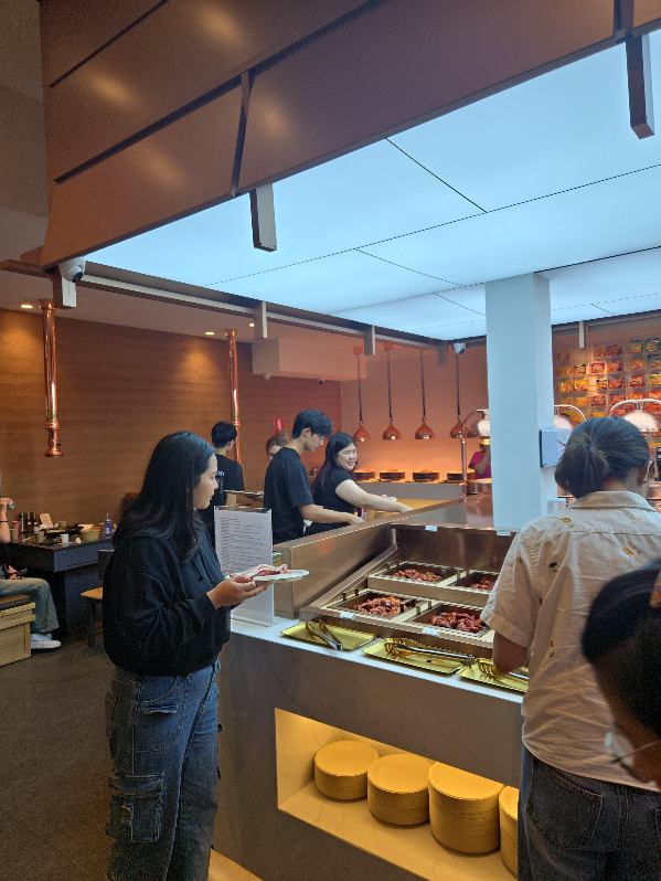 The food was quite standard. Nothing stood out and there were limited banchan dishes if you’re wanting a Korean experience. The cooked dishes were a mix of Chinese/korean which were ok. A concerning issue would be the misuse of tongs at almost every section of the buffet. I was so shocked to see tongs that were used for raw marinated prawns side dish with the cooked fish cake. Serious contamination issues and would recommend separate tongs for every single item you have. Even with the sushi…. Mixing the tongs that were used for salmon avo with the vegetarian could cause issues with those who don’t want raw food touching cooked food… Sauce station really needs small plates to carry the sauces. People ended up using drinking cups to dip their bbq meat in. There was always a race to grab the sashimi. Groups of people formed a queue to get some (which was nice). BUT you would have other rude people jumping it and grabbing more than they should or people in the queue grabbing a lot too. It didn’t come out often during the 90 min period, with maybe 2 reloads of a tray of tuna and salmon.