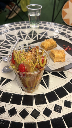 What stands out at Kaneffi is how modern the place is which then translates to the desserts! Walking in, you are welcomed with a long display of sweets including traditional baklava as well as fun ones like nutella and oreo baklavas. Even better is how you can make your own dessert dish! Think starting with a base, then adding presuggested toppings and then even more extra toppings! This is what makes this place so much fun and unique and different from what we've seen!