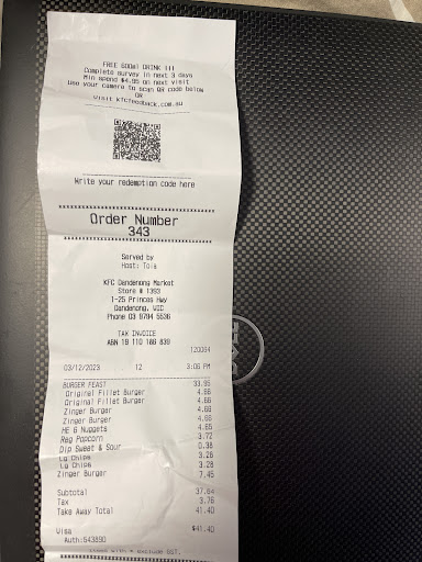 I don't like what they play inside I don't like the radio thing they use I am like just leaving the place as soon as it says something I don't approve of and so for whoever runs/is in charge of this kind of stuff with the kfc resturant if your going to play something have some instrumental music playing that way it's guaranteed to not be what some people dislike at the very least and one time I went to kfc and there was no radio stuff being played no news no music was being played and that was yeah acceptable by me in particular and yeah that day there was apparently just 1 person that appears to be male in appearance serving all the customers and I went to try and get the free 600ml that you can get if you give a review and 1 person that appears to be female in appearance was like you got to use it on the day that you get it then I showed the person that you can use it 14 days after you get the code for the 600ml drink after writing a review and then the person said the code is read and so it's been used then I had to do some research about it and I found out that the code being red does not mean it's been used and yeah I never used the code and so I went and told the person the information I found out and then it said that I got to buy something in the store that cost $4.95cents in store instead of online cause it was like you got to buy $4.95cents+ meal and I was like I just brought a 10$ online meal and then yeah it said you got to buy the meal in store rather then online to use the code and they just add the water to the meal you buy next time you go buy the meal and yeah I had to wait for like 10 minutes 4 times throughout the conversion cause it kept on saying wait a second throughout the conversation but yeah that same person did help me get a free 600ml drink in the past and the chips did taste a bit stale in the meal I had today when...