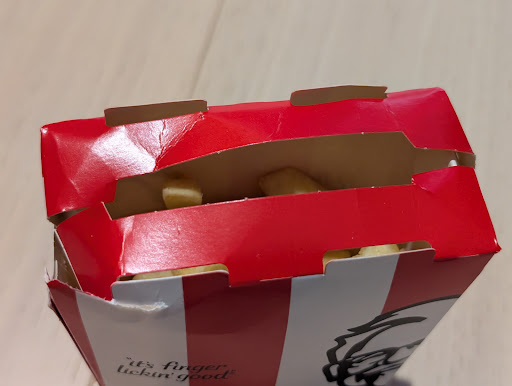 We promptly returned to the store to address the issue. Upon explaining the situation to the staff member, they insisted that they had indeed packed the Regular Chips and suggested that I had made an error in my inspection. Despite their assurance, it was evident that the chips were not present in the box due to the cramped space caused by combining both orders into one container.