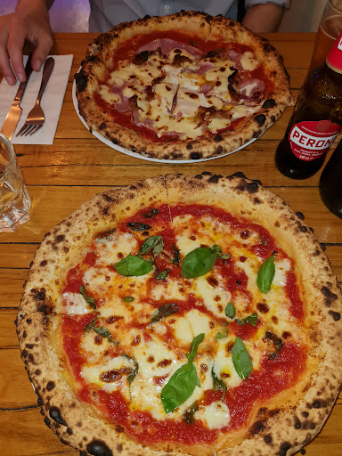 Unfortunately what looked like great pizzas sadly were missing a very important element.. Being cooked!! Firstly, when the pizza arrived we were surprised at how quick it was. Not service quick, but cooking time quick. They looked good, were burnt around the edges, which isn't a big issue, until I realised some areas so much so that it was burnt to the degree that it turned into charcoal and crumbled into black, dust like residue on the table when I touched it. But the main issue was trying to eat it. When I tried to pick up a slice I realised that was impossible, couldn't even fold it from side to side. So I folded it from the tip to the crust, then again, so basically if the crust wasn't attached it would be like rolling a pancake. It actually felt like a pancake too. Same texture. It also has alot of liquid dripping from it, (not oily) that would have only come from the buffalo mozzarella, meaning they haven't dried it out then drained and strained it. If this isn't done you get a watery pizza. So a combo of not prepping the buffalo mozzarella fully and 100% undercooked Now, I'm no expert, but I do know that the pizza dough when cooked should be firm and have a slightly crisp bottom from being cooked in the high heat of a wood-fired oven. The goal is to achieve a good balance of crispy and chewy texture, not a pancake-like softness that can easily be rolled up. Which is what I had. The other pizza was the same, but had a doughy taste to it too. Topping flavours were very nice on my charcoal edge pancake.