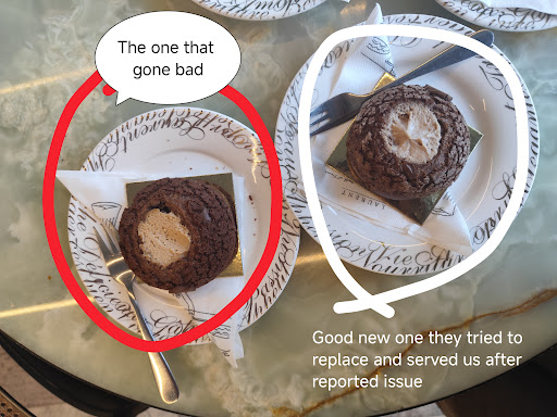 We raised our concerns with the staff immediately. They took the spoiled product away but refused to offer a refund. Instead, they provided a replacement and claimed that the pastry had only been made that morning and should still be safe. When we asked to escalate the matter to a manager, the staff refused to provide any contact information. More worryingly, they attempted to discard the spoiled product in the bin, which appeared to be an effort to avoid accountability and eliminate evidence.