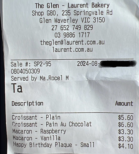 Read moreI like Laurent cakes & savoury pastries and have been to different stores, but I've never experienced such rude service as I did today. Firstly, I waited to be served in the queue, but the girl served a guy behind me somehow before me, so when I was served by this blond girl, I simply said that I was here before him, then the girl gave me this look 'so what? I don't care' and said "OK". I ordered a few pastries & cakes. However, when I was nearly home and I opened the box, I found that she gave me one less item... I could just forget about the pastry, but I was so upset with that girl's rude attitude and she also didn't pack all the items (who knows if she did that on purpose?). So, I went back to the store and told her that she missed one item and charged me more than what I've received. Then, she said, "OK" BUT no sorry at all. However, the pastry I ordered and paid for was sold out by the time I got back. When I raised it with the girl who served me, again she didn't say sorry at all. Thankfully another staff member gave me a refund and did actually say sorry. When I said that the person that did the wrong thing should say sorry, the rude girl said "OK, sorry I didn't mean it". Of course, you shouldn't mean to charge me more and miss one item! I just wanted a sincere apology as she didn't do her job properly and made me go back. If she doesn't want to serve customers in an appropriate way, she shouldn't do customer service work. I didn't get her name, but she was the only blond girl working at 7pm shift...