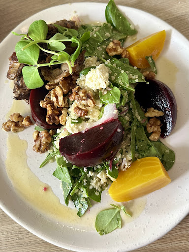 We dined in and enjoyed a tasty lunch last Thursday around 1pm. The cafĆ© was busy and buzzing, full of workers from nearby businesses enjoying lunch and people ordering takeaway from the counter. Despite the pace, we were warmly greeted by friendly staff and our orders placed within minutes. The food arrived quickly and we enjoyed the āJust Beet itā salad with braised lamb, which was super tasty (we couldnāt get enough of the maple walnuts) and the citrus pork burrito bowl. Both were well presented and delicious!