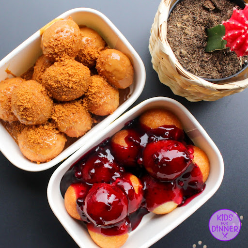 📷 Biscoff Loukoumades – Melted Biscoff & Lotus Crushed Biscuits 📷 Berry Loukoumades – Filled Lukumama Vanilla Cheesecake and Blueberry Jam